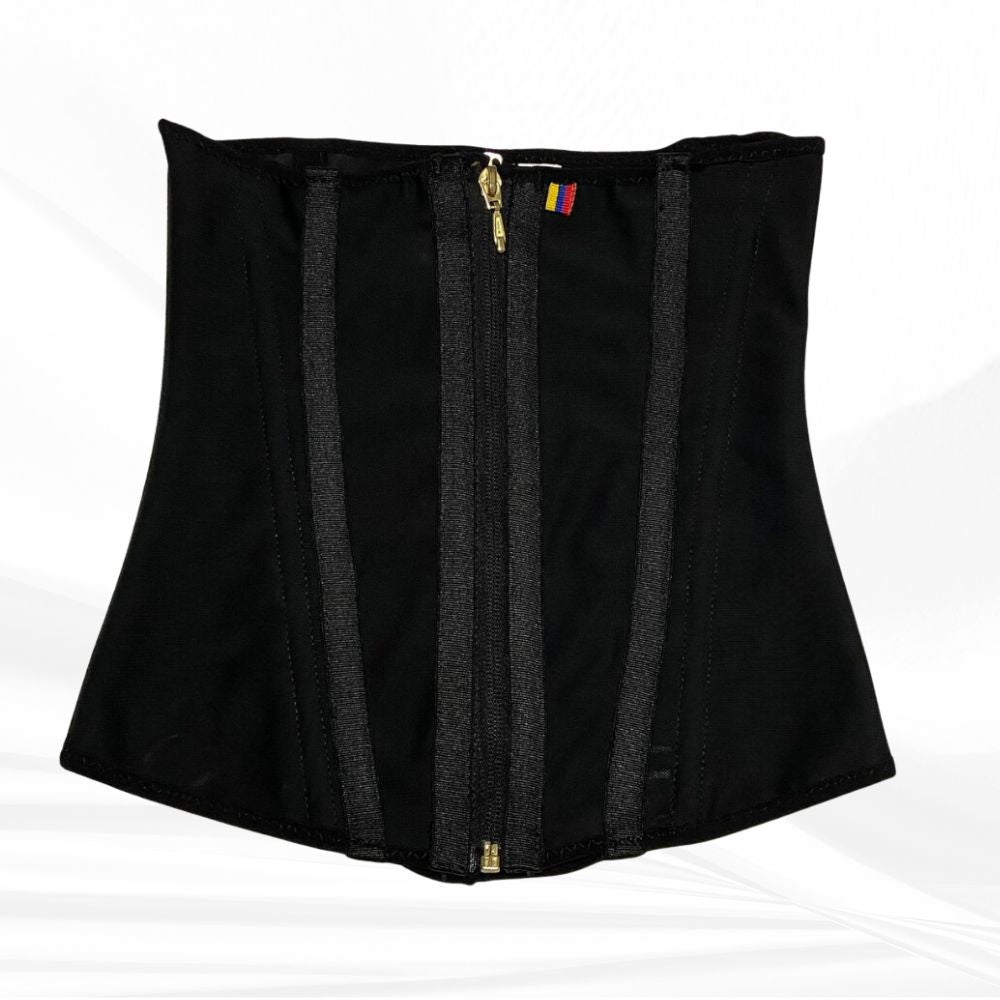 CARACTERÍSTICAS - Hecha en Powernet de Calidad, con 4 capas de refuerzo delantero abdominal.- Fabricación Colombiana.- 9 Varillas metálicas trenzadas en espiral para evitar que se enrolle en la zona del abdomen (no son varillas plasticas).- Tela interna traspirable.- Cremallera frontal separable, puede llegar con deslizador dorado o negro según disponibilidad inmediata.- 3 lineas de broches internos para mejor ajuste.-